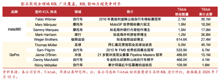 經(jīng)典案例:根據(jù)各公司官網(wǎng)、Tiktok、華源證券研究所等綜合資訊表明,影石實現(xiàn)全領(lǐng)域 KOL 廣泛覆蓋,KOL影響力超競爭對手。