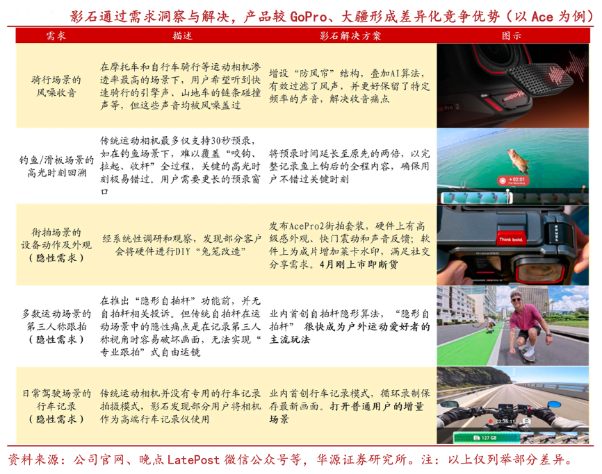 經(jīng)典案例:根據(jù)公司官網(wǎng)、晚點LatePost微信公眾號等、華源證券研究所等綜合資訊表明,復盤影石產(chǎn)品發(fā)展歷程,公司創(chuàng)新的推出了一系列實用功能,滿足了全景/運動相機不同場景的細分需求。如:1)騎行“防風簾”:為了保留快速騎行的引擎聲,同時消除風噪,公司開發(fā)了騎行防風簾結(jié)構(gòu),并疊加 AI 算法,可有效過濾風聲。