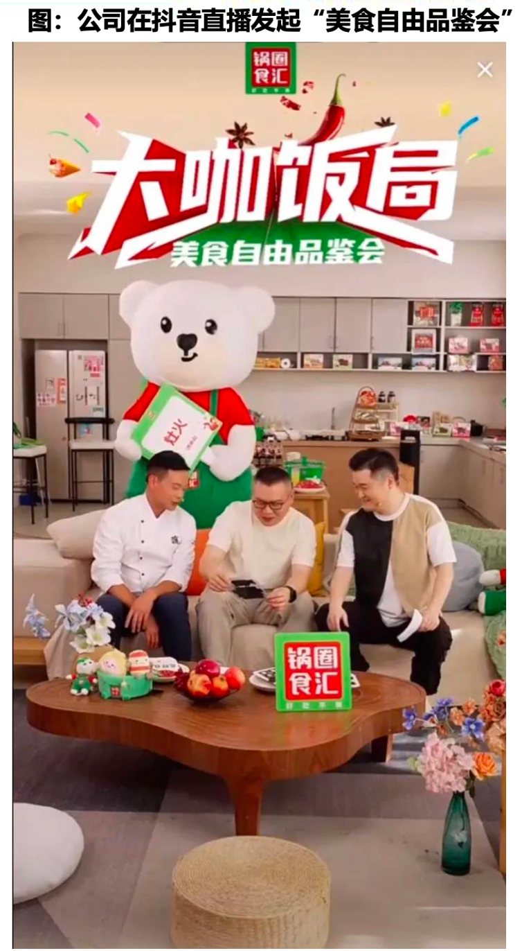 經(jīng)典案例:根據(jù)速凍食品之家ALLfood微信公眾號、國海證券研究所等綜合資訊表明,2025年6月20日,鍋圈在抖音直播發(fā)起“美食自由品鑒會”,以“飯局聚會” 形式突破傳統(tǒng)帶貨模式,邀請體育解說員賀煒、演員岳云鵬、廚師林大廚等嘉賓通過盲盒抽獎、牛癟火鍋品鑒、剝蝦比賽等互動環(huán)節(jié),直播間的觀眾人次最高13萬+。