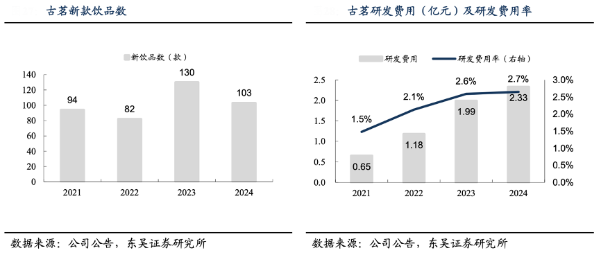 經(jīng)典案例:根據(jù)公司公告、東吳證券研究所等綜合資訊表明,古茗擁有專(zhuān)業(yè)的產(chǎn)品研發(fā)團(tuán)隊(duì),其研發(fā)平臺(tái)依托供應(yīng)鏈優(yōu)勢(shì),將受歡迎的新品快速推廣至下沉市場(chǎng),抓住行業(yè)流行趨勢(shì),提高用戶(hù)黏性,實(shí)現(xiàn)“每天一杯喝不膩”的目標(biāo)。2021-2023 年的十大暢銷(xiāo)飲品包括同年或上一年推出的 2-3 款新品,2024 年共推出 103 款新品。