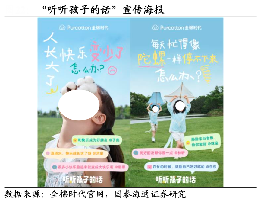 經(jīng)典案例:根據(jù)全棉時(shí)代官網(wǎng)、國泰海通證券研究等綜合資訊表明,全棉時(shí)代公司在兒童節(jié)來臨之際,會(huì)策劃“聽聽孩子的話”主題征集及地鐵創(chuàng)意展覽、聽聽孩子的話主題片、線下童裝秀 等,傳遞出傾聽孩子、更懂孩子的品牌形象,搭建大人與孩子奔赴的橋梁。