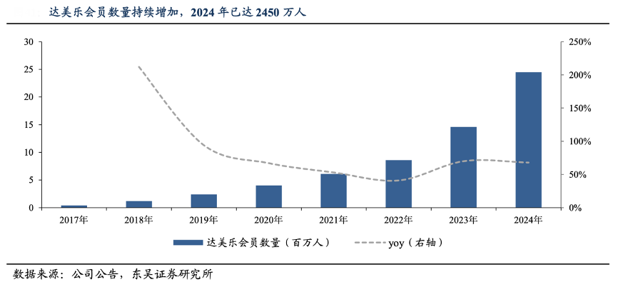 公司最近 2 年保持每季度新增 300-400 萬會員(年新增 1000 萬會員)的節(jié)奏平穩(wěn)擴(kuò)張。2024 年底國內(nèi)會員數(shù)量 2450 萬人,同比增長 68%,至 25Q1 會員數(shù)已達(dá) 2700 萬。