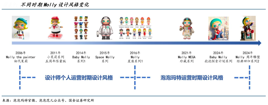 經(jīng)典案例:根據(jù)泡泡瑪特官微、泡泡范兒公眾號(hào)、國金證券研究所等綜合資訊表明,在泡泡瑪特接管運(yùn)營后,Molly的設(shè)計(jì)風(fēng)格經(jīng)歷了漸進(jìn)式調(diào)整,頭身比例更加協(xié)調(diào),面部輪廓線條趨于柔和化處理,整體造型風(fēng)格向甜美化、高親和力的方向演變。Molly 憑借差異化的形象迅速占領(lǐng)年輕消費(fèi)者心智。其設(shè)計(jì)兼具“萌系”與“藝術(shù)感”,精準(zhǔn)契合 Z 世代對(duì)個(gè)性化和情感價(jià)值的追求。
