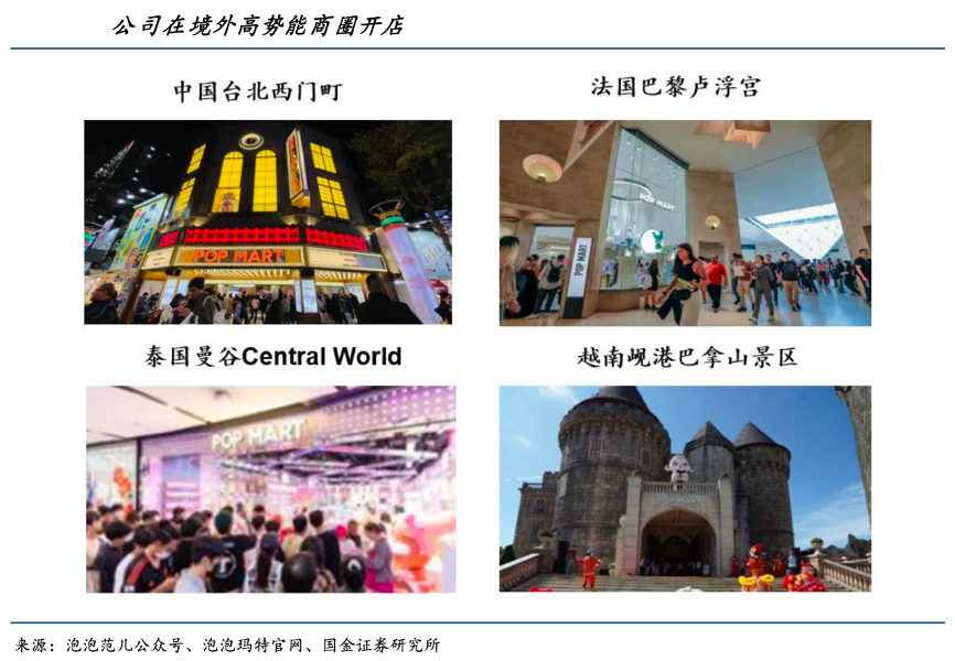 經(jīng)典案例:根據(jù)泡泡瑪特官網(wǎng)、泡泡范兒公眾號(hào)、國金證券研究所等綜合資訊表明,2023 年 5 月泡泡瑪特海外首家古堡主題店巴拿山樂園古堡主題店在越南峴港盛大開業(yè),位于目前越南客流量最大的主題公園;2024年品牌勢(shì)能 躍遷,向歐洲拓展 7 月泡泡瑪特盧浮宮店在 CARROUSEL DU LOUVRE 正式開業(yè),距離博物館 次入口和倒玻璃金字塔僅僅幾步之遙,成為首個(gè)成功進(jìn)駐盧浮宮的中國潮玩品牌。