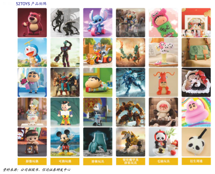 經(jīng)典案例:根據(jù)公司招股書、信達(dá)證券研發(fā)中心等綜合資訊表明,52TOYS 構(gòu)建覆蓋靜態(tài)玩偶、可動玩偶、變形機(jī)甲及拼裝玩具、發(fā)條玩具、毛絨玩具及衍生周邊的多品類產(chǎn)品體系。公司針對不同 IP 的獨(dú)特風(fēng)格量身定制產(chǎn)品,如電影《流浪地球 2》的變形機(jī)甲及拼裝玩具反映了電影的科幻本質(zhì)。