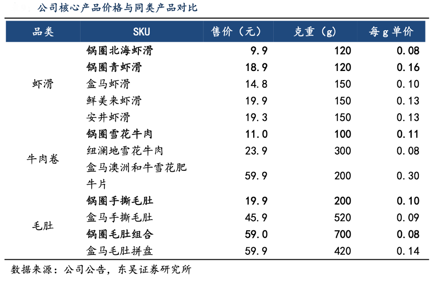 經(jīng)典案例:根據(jù)公司公告、東吳證券研究所等綜合資訊表明,以蝦滑為例,鍋圈公司在廣西北海投資建設(shè)的逮蝦記工廠,依托當(dāng)?shù)貎?yōu)質(zhì)青蝦資源,再加上規(guī)?;蓪⒃铣杀窘档?30%。公司的基礎(chǔ)款蝦滑產(chǎn)品比盒馬自有品牌、鮮美來(lái)、安井的售價(jià)都更有性價(jià)比,拳頭產(chǎn)品毛肚組合也是極具價(jià)格優(yōu)勢(shì)。