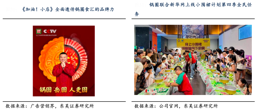 經(jīng)典案例:根據(jù)廣告營(yíng)銷界、公司官網(wǎng)、東吳證券研究所等綜合資訊表明,2021 年鍋圈食匯成為 CCTV 體育頻道的美食合作伙伴;2022 年公司精準(zhǔn)鎖定《加油!小店》和 《暖暖的火鍋》兩檔衛(wèi)視熱門綜藝,以此建立年輕大眾化溝通陣地;2024 年 7 月公司聯(lián) 合新華網(wǎng)上線暑期檔全民任務(wù)——小圍裙計(jì)劃第四季。