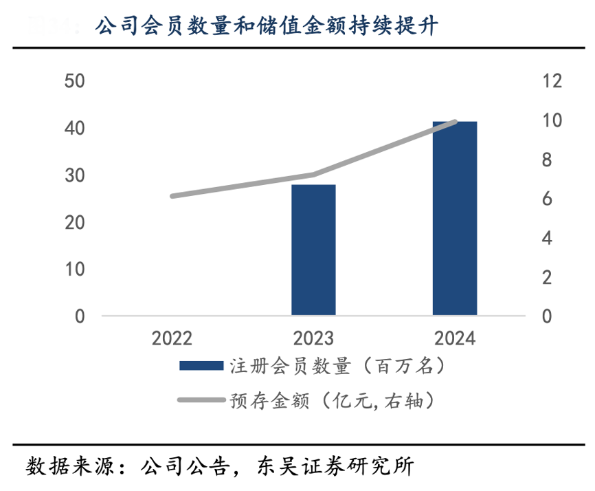 經(jīng)典案例:根據(jù)公司公告、東吳證券研究所等綜合資訊表明,鍋圈截至 2024 年底注冊(cè)會(huì)員數(shù)量達(dá)到 4130 萬(wàn),同比增長(zhǎng) 48.2%。公司預(yù)存卡金額也有逐年提升的趨勢(shì),從 6.1 億元提升到 9.9 億元,且當(dāng)年的預(yù)存卡消化率基本都維 持在 80%上下。