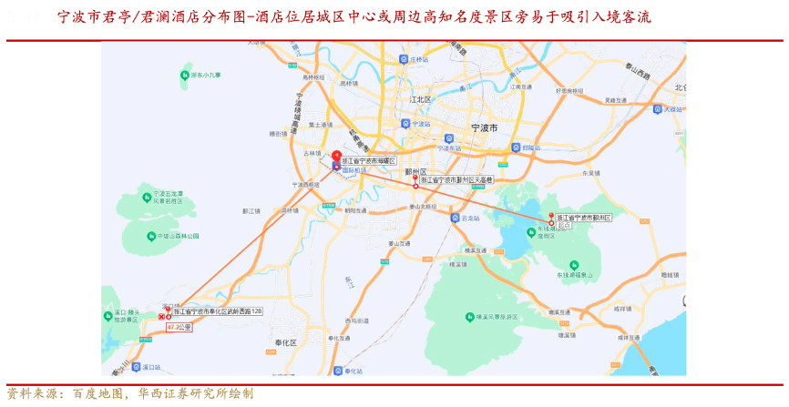 經(jīng)典案例:根據(jù)百度地圖、華西證券研究所等綜合資訊表明,浙江省內(nèi)有杭州蕭山、寧波櫟社、溫州龍灣、金華義烏國際機(jī)場,溫州、舟山海港口岸共六個口岸,相應(yīng)城市均有君亭/君瀾酒店分布且分布位置與城市核心城區(qū)/重要周邊景點(diǎn)相近。