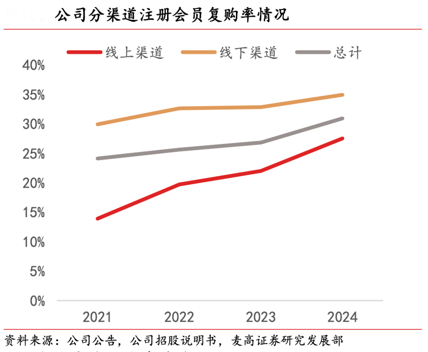 經(jīng)典案例:根據(jù)公司公告、公司招股說明書、麥高證券研究發(fā)展部等綜合資訊表明,毛戈平公司用戶忠誠度多年來持續(xù)提升,2024 年線下渠道和線上渠道會(huì)員復(fù)購率分別為 34.9%和 27.5%,線下渠道憑借體驗(yàn)優(yōu)勢復(fù)購率較線上渠道高出 7.4pct。