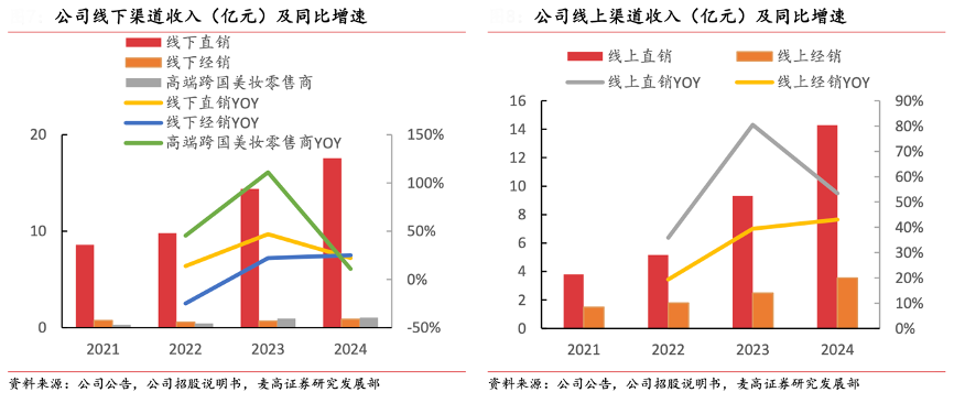 經(jīng)典案例:根據(jù)公司公告、公司招股說明書、麥高證券研究發(fā)展部等綜合資訊表明,毛戈平2024年線下渠道、線上渠道收入分別為 19.5 億元和 17.8 億元,分別同比+21.6%和+51.2%,占比分別為 52.2%和 47.8%,線下渠道作為公司基本盤維持兩位數(shù)增長(zhǎng),線上渠道收入高速提升。